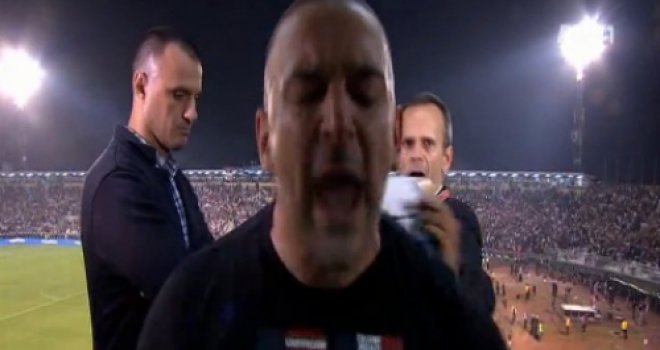 Dok je Predrag Strajnić, reporter RTS-a, na tribinama stadiona Partizana razgovarao sa gostima o prekidu utakmice, Mikić se probio do kamere, sve vrijeme uzvikujući uvrede na račun Aleksandra Vučića, premijera Srbije.