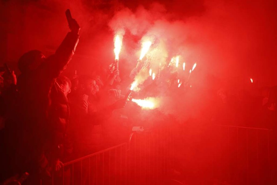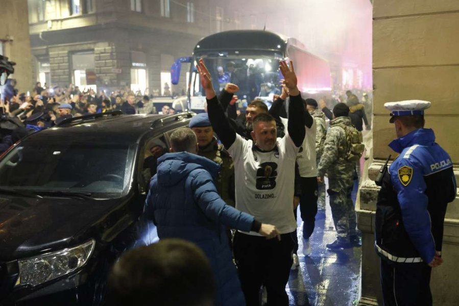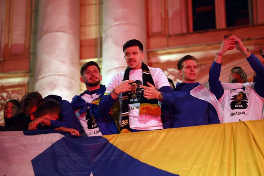 Vrhunac večeri bio je dolazak reprezentativaca koji su se popeli na balkon i uz navijačke pjesme, bakljadu i vatromet, zajedno s okupljenim građanima proslavili veliki uspjeh.