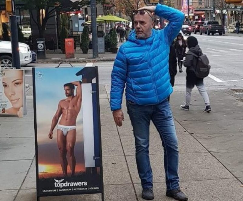 Slavni glumac slikao se na jednom od autobuskih stajališta na kojem je stajao bilbord sa golišavim manekenom koji reklamira donji veš. Kojo je pokušao da se našali, pa zauzeo isti stav, ali - obučen.
