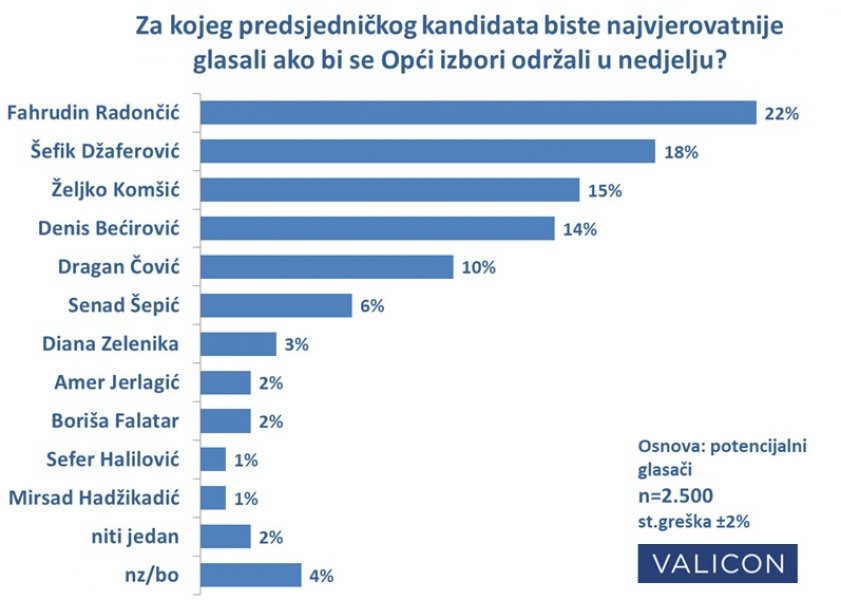 Na pitanje, svim potencijalnim glasačima u FBiH, „Za kojeg predsjedničkog kandidata biste najvjerovatnije glasali, da se Opći izbori održavaju u nedjelju?“, Fahrudin Radončić je ubjedljivo prvi izbor glasača s rezultatom od 22%. Slijedeći je Šefik Džaferović s 18%, potom Željko Komšić s 15%, Denis Bećirović s 14%, te Dragan Čović s 10%. Ostali kandidati imaju 6% ili značajno manji ukupni rezultat.