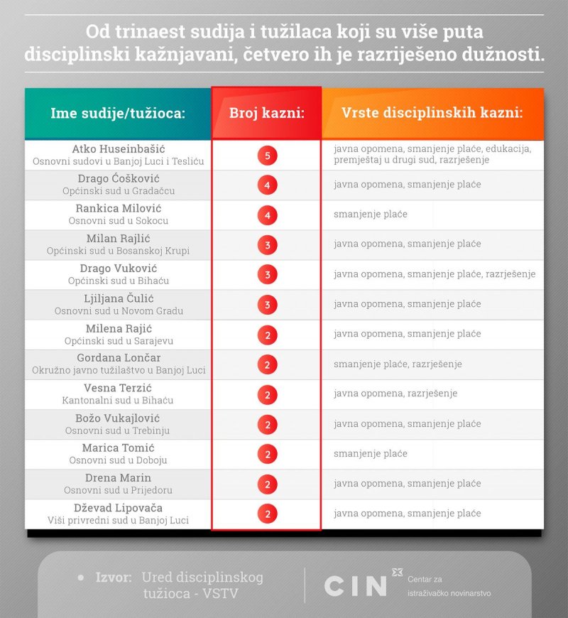 Podaci do kojih su došli novinari CIN-a pokazuju da je još najmanje 12 sudija i tužilaca više puta kažnjavano − neki od njih i po tri ili četiri puta. Troje ih je razriješeno, drugi su ostali raditi u pravosuđu.