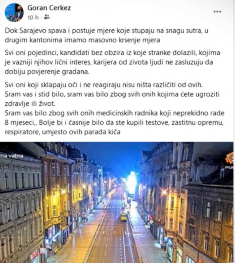"Dok Sarajevo spava i poštuje mjere koje stupaju na snagu sutra, u drugim kantonima imamo masovno kršenje mjera. Svi oni pojedinci, kandidati bez obzira iz koje stranke dolazili, kojima je važniji njihov lični interes, karijera od života ljudi ne zaslužuju da dobiju povjerenje građana. Svi oni koji sklapaju oči i ne reagiraju nisu ništa različiti od ovih. Sram vas i stid bilo, sram vas bilo zbog svih onih kojima ćete ugroziti zdravlje ili život. Sram vas bilo zbog svih onih medicinskih radnika koji neprekidno rade 8 mjeseci. Bolje bi i časnije bilo da ste kupili testove, zaštitnu opremu, respiratore, umjesto ovih parada kiča", napisao je Čerkez.
