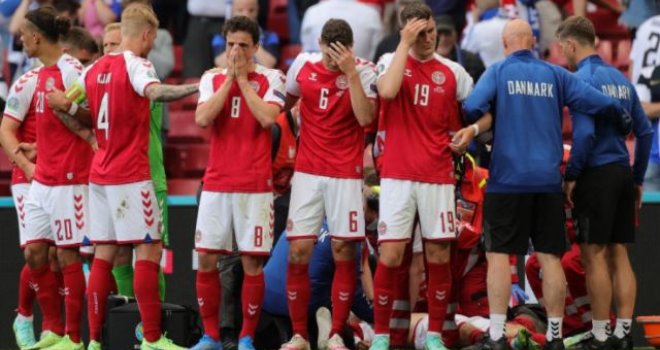 Nogometaš Danske Christian Eriksen srušio se na travnjak, a ljekarski tim je više od 10 minuta na terenu mu ukazivao pomoć. Danski reprezentativci stali su oko suigrača i štitili ga od kamera, a nakon desetak minuta Eriksen je iznešen sa stadiona pod paravanima.