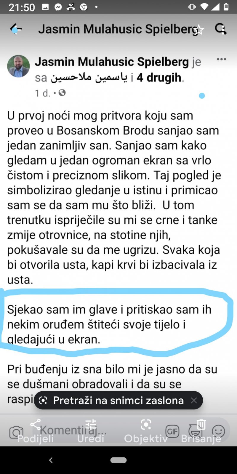 Jasmin Mulahusić je na svom profilu objavio post u kojem opisuje jedan od svojih bizarnih snova u kom su ga napale zmije, kako im reže glave, te da je jedna od onih iz njegovog sna Borka Rudić.