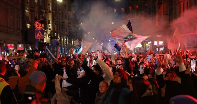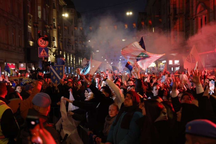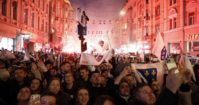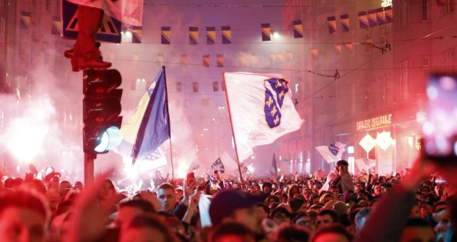 Desetine hiljada ljudi okupilo se noćas u Sarajevu u Titovoj ulici, ispred Vječne vatre, gdje su dočekali nogometaše BiH sa kojim su proslavili plasman na Svjetsko prvenstvo.