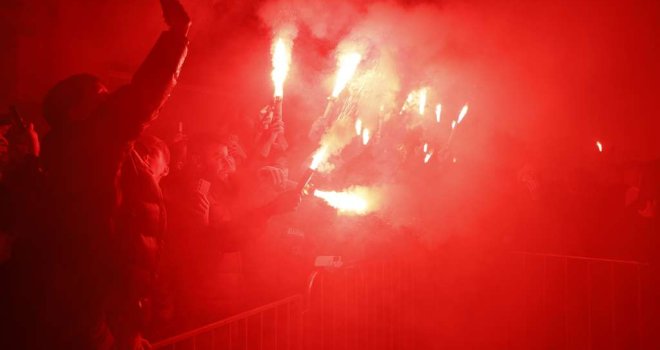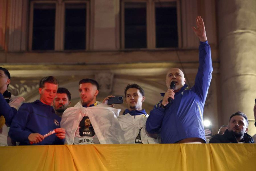 Vrhunac večeri bio je dolazak reprezentativaca koji su se popeli na balkon i uz navijačke pjesme, bakljadu i vatromet, zajedno s okupljenim građanima proslavili veliki uspjeh.